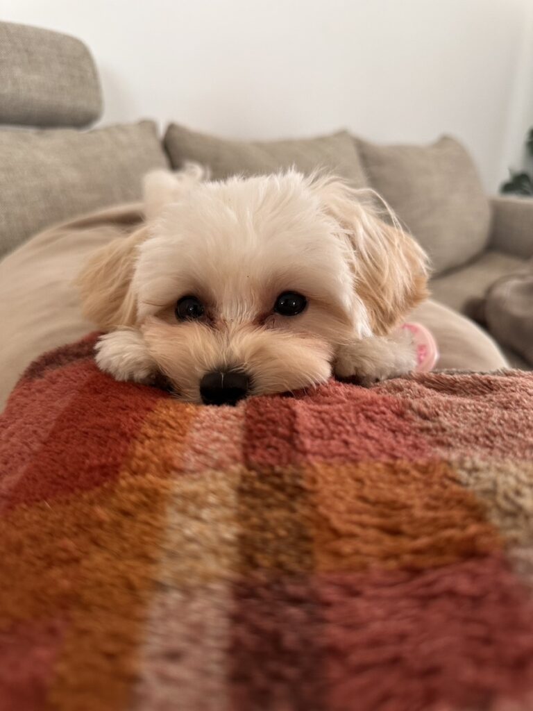 マルチーズとトイプードルのミックス、いわゆる「マルプー」のブランです。 真っ白で綿菓子のような毛並み。クリフとはまた違う、犬特有の「全身で喜びを表現する姿」に一目惚れしてしまいました。