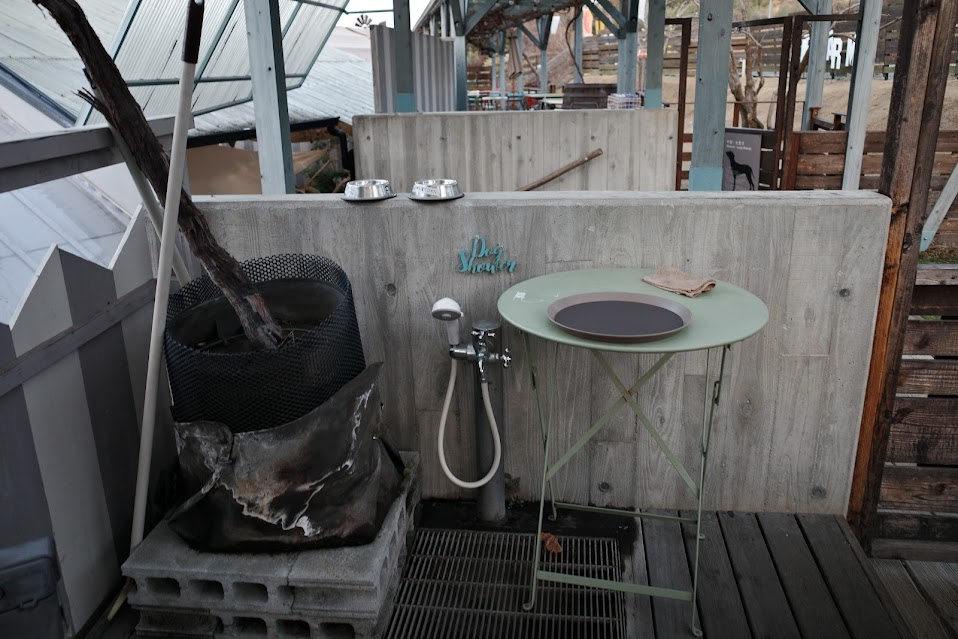 遊んだ後も安心で、テラス席には専用の足洗い場が完備されています。犬用の水入れボウルも貸し出してくれるので、荷物を減らしてフラッと立ち寄れるのが本当にありがたいですね。