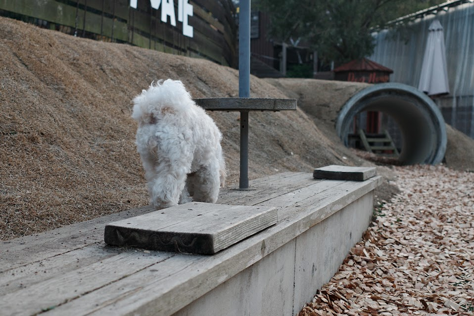 少しお腹が満たされたところで、併設されているドッグランエリアへブランを放してあげました。このテラス席の最大の魅力は、席のすぐ横が適度な広さのドッグランになっていて、ドリンクを飲みながら愛犬が遊んでいる姿をゆっくり見守れることなんです。