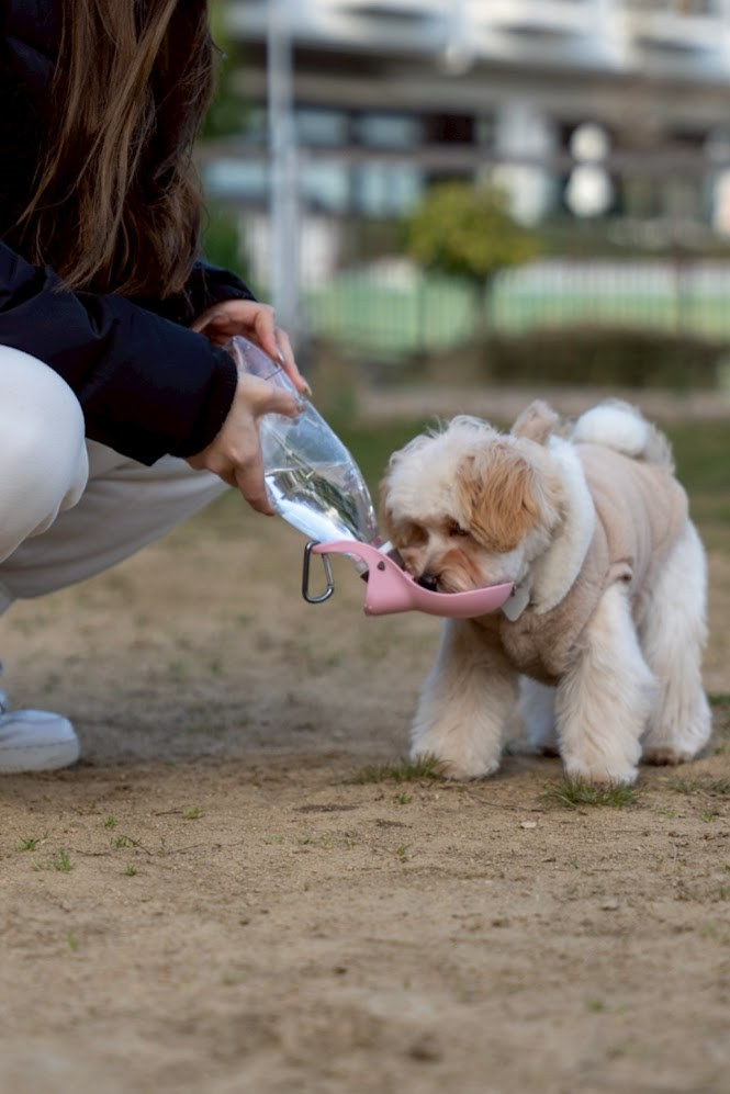 走り回るわんちゃんの水分補給には、片手でサッと給水できるボトルが便利です。僕たちが愛用しているのはこちら。