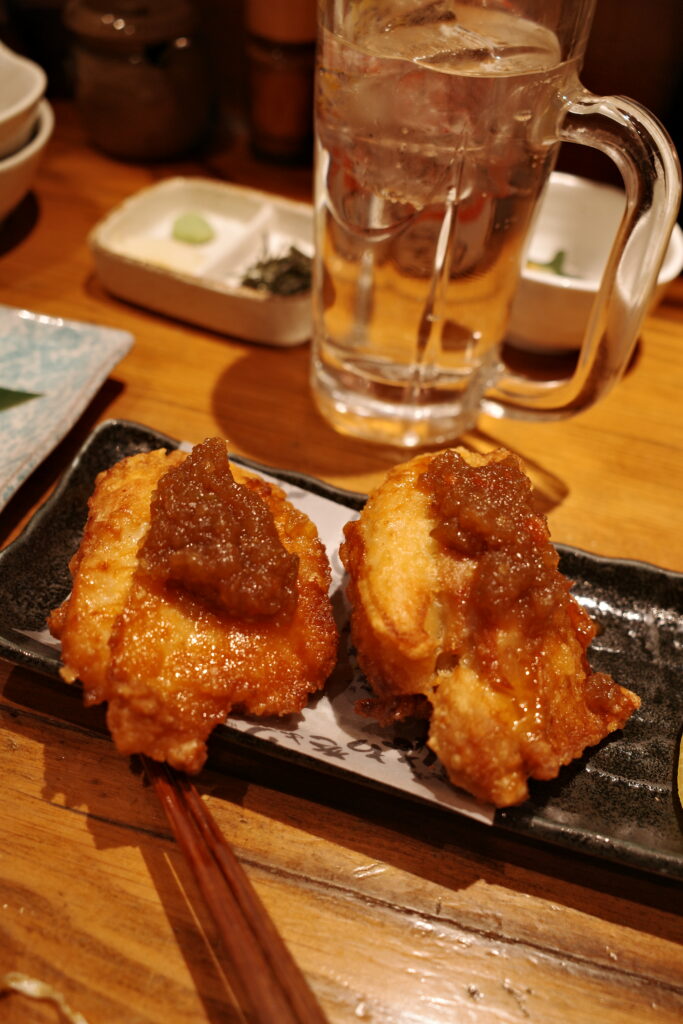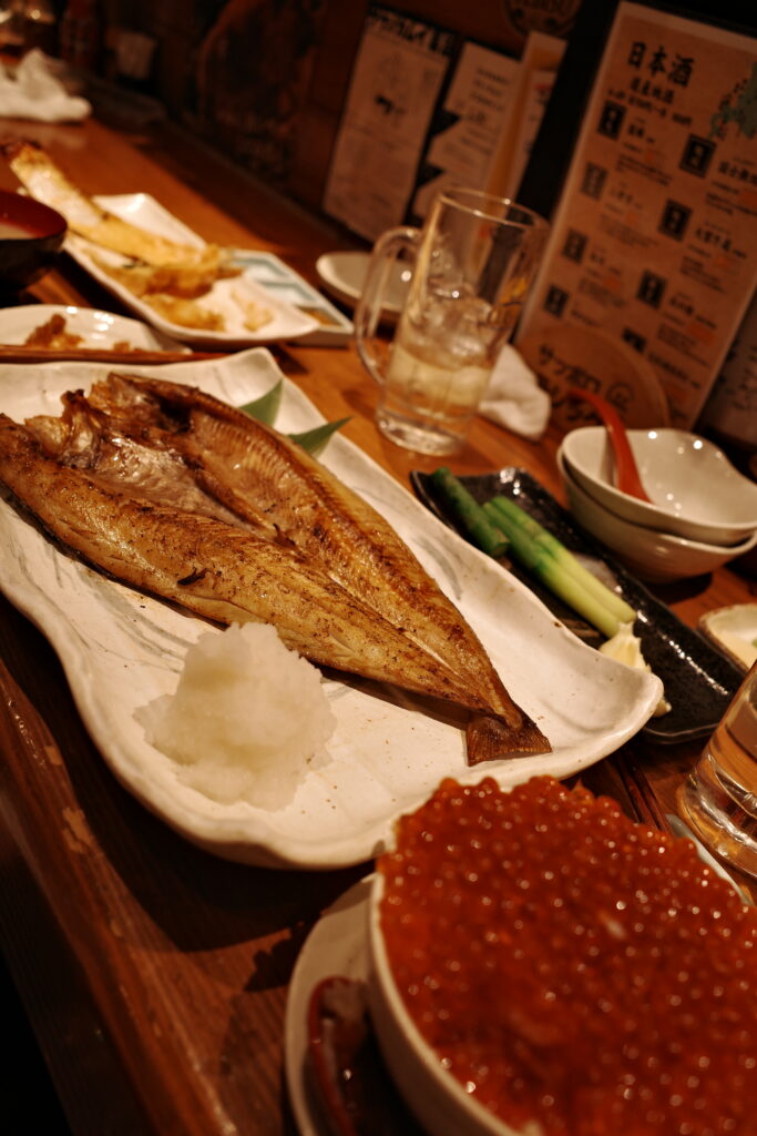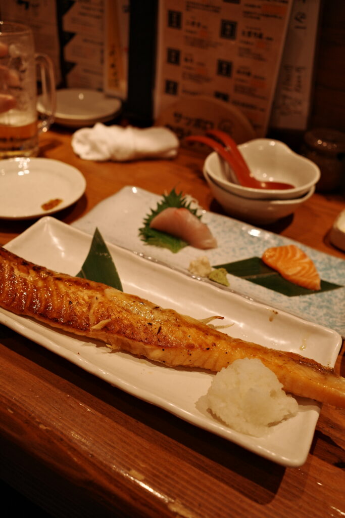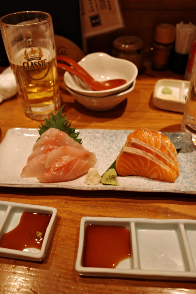 僕は唯一食べられる「サーモンのお刺身」を注文。脂がしっかり乗っていて、とろけるような美味しさでした! 他にも、特大のホッケの開きやザンギなど、北海道ならではの品を次から次へと注文。
