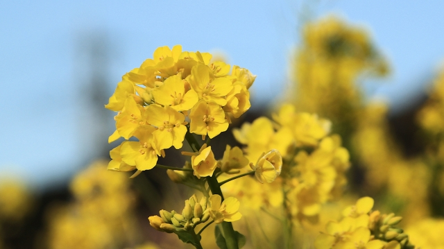 菜の花を撮る時は、カメラを思い切って地面スレスレまで下げるローアングルでの撮影が効果的です。手前の花を大きくぼかして入れると、一気にプロっぽい写真になります。