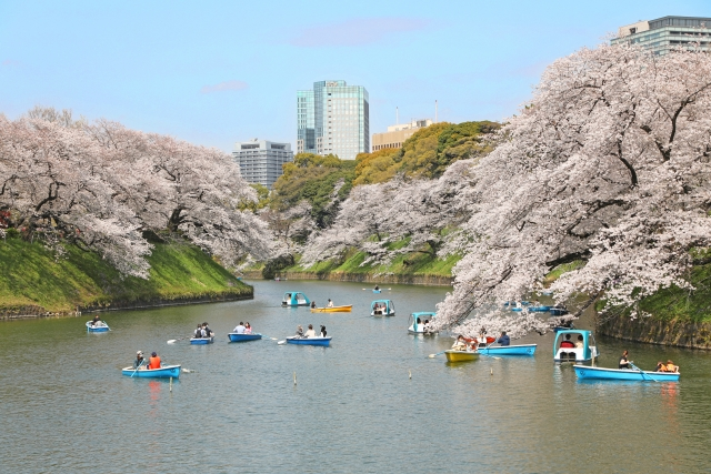 皇居のお堀沿いに咲き誇る桜は、都内屈指の絶景です。水面に届きそうなほど枝垂れる桜と、そこを行き交うボートの風景は、まさに絵に描いたような春の光景。