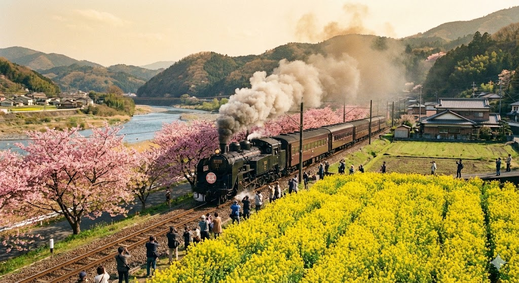 「鉄道×春の風景」を撮るなら外せないのがこちら。ノスタルジックなSL列車と、沿線を彩る菜の花や桜のコラボレーションは、どこか懐かしさを感じさせる1枚になります。